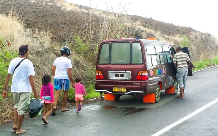La location de scooter est hors de prix (150 000 Rp/jour contre 70 000 Rp un peu partout en Indonésie), éloignés de tout, l’hôtel à le monopole. Pour la soirée nous le louerons 50 000 Rp,